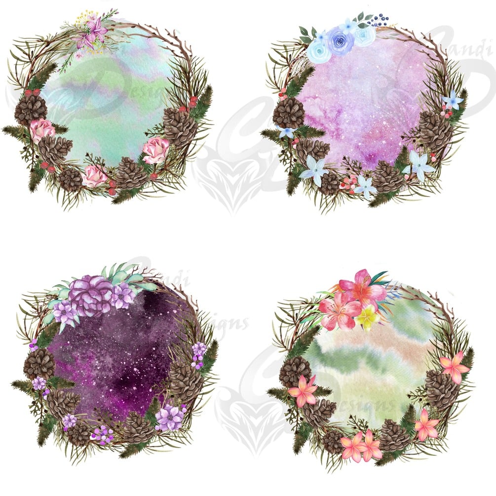 Beautiful wreath and watercolour splash elements perfect for any kinds of design purposes, t-shirts, mugs, or even just as clip art in your own designs.